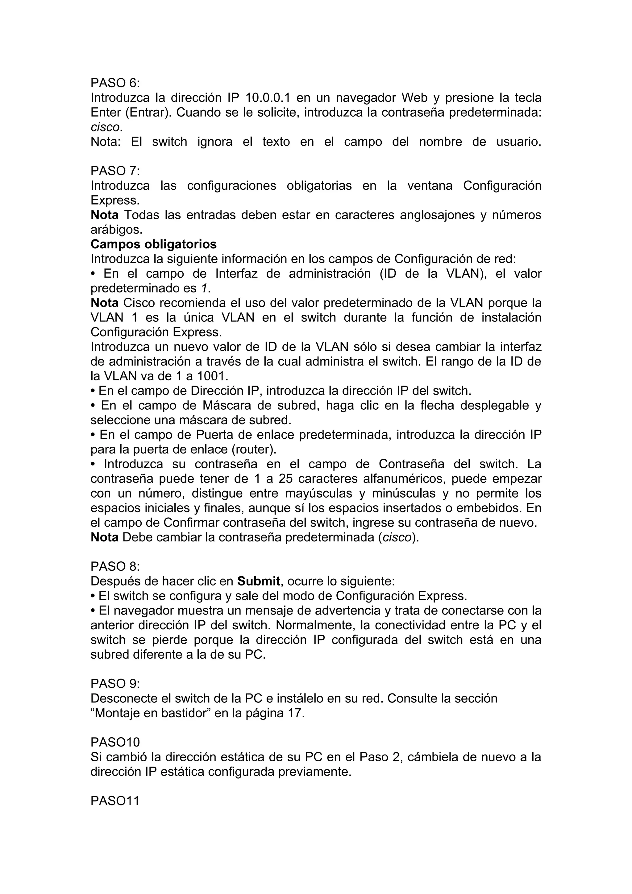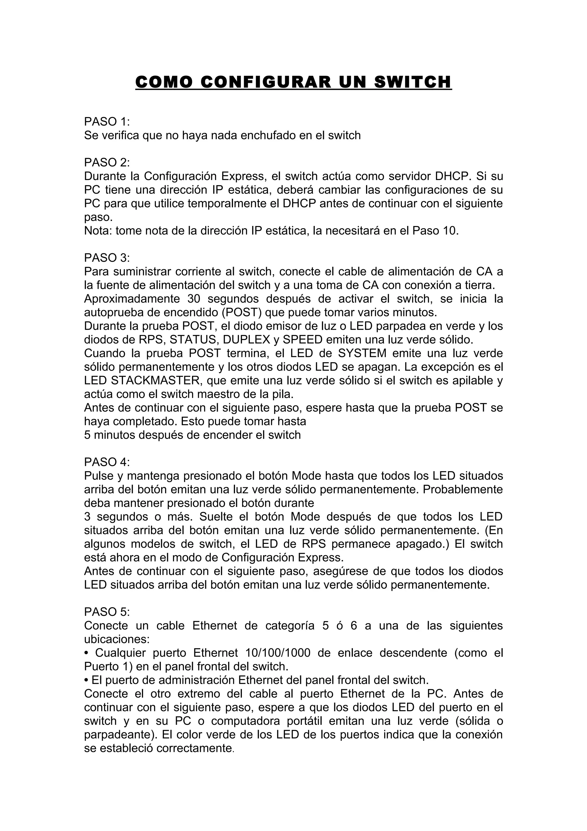 Este documento proporciona 11 pasos para configurar un switch: 1) verificar que no haya nada enchufado, 2) usar DHCP temporalmente si la PC tiene una dirección IP estática, 3) encender el switch y esperar a que finalice la autoprueba, 4) poner el switch en modo de configuración express, 5) conectar un cable Ethernet entre el switch y una PC, 6) acceder a la interfaz web de configuración usando una dirección IP y contraseña predeterminadas, 7) introducir la configuración de red obligatoria como la dirección IP del switch, 8