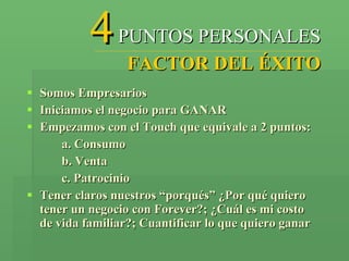 El documento presenta los 4 puntos personales como un factor clave para el éxito en el negocio de Forever Living Products, ya que permite calificar para bonificaciones y ascensos. Recomienda consumir y recomendar productos por valor de 4 puntos mensualmente para establecer un cimiento sólido en la compañía. También destaca la importancia de clarificar los objetivos financieros para mantener la motivación en el negocio.