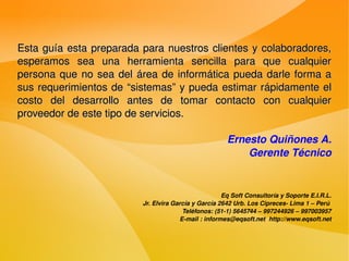 La guía de EQ Soft ofrece instrucciones para solicitar cotizaciones de desarrollo de software, diseñada para ayudar a clientes sin experiencia en informática a definir sus necesidades y estimar costos. Se abordan preguntas sobre la necesidad de software, sus beneficios, la opción de software a medida y cómo definir requerimientos específicos antes de contactar a proveedores. También se destaca que la implementación de software es una inversión significativa y que es crucial tener claridad en los requerimientos para un adecuado desarrollo del proyecto.
