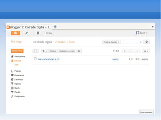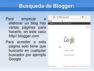 Crear un blog en Blogger requiere registrarse con una cuenta de Gmail, completar un cuestionario, validar el número de teléfono, diseñar la apariencia del blog mediante plantillas y configuraciones, y luego crear entradas de blog usando el editor de texto de Blogger. Los archivos de texto se pueden subir a Calameo y pegar el código HTML en una entrada de blog.