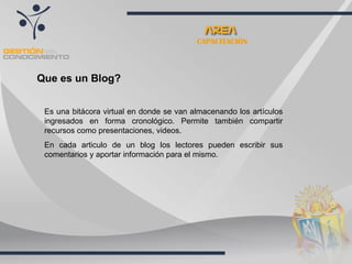 Este documento explica cómo crear y administrar un blog usando el servicio Wordpress. Describe los pasos para crear una cuenta en Wordpress, incluyendo llenar un formulario con datos personales y confirmar la cuenta a través de correo electrónico. Una vez creada la cuenta, los usuarios pueden agregar nuevas entradas de blog, editar o eliminar entradas existentes, agregar etiquetas y categorías, y ver estadísticas de visitas.