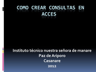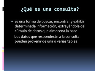 Este documento explica los 8 pasos para crear una consulta en Microsoft Access: 1) Abrir la base de datos, 2) Usar el Asistente de consultas sencillas, 3) Seleccionar la tabla, 4) Seleccionar los campos, 5) Elegir un detalle o resumen, 6) Configurar opciones de resumen, 7) Agrupar registros, 8) Nombrar y finalizar la consulta.