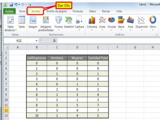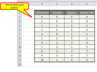 El documento proporciona instrucciones para crear un gráfico a partir de datos en una tabla, incluyendo seleccionar un tipo de gráfico, elegir los datos, ajustar la serie numérica, personalizar el diseño y títulos del gráfico, y colocar el gráfico creado.