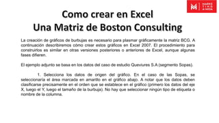 Este documento describe cómo crear gráficos de burbujas en Excel 2007 para plasmar la matriz BCG. Explica que se deben seleccionar los datos relevantes en el orden correcto, crear un gráfico estándar y luego personalizarlo eliminando líneas secundarias, modificando los ejes X e Y de acuerdo a los parámetros del caso de estudio y cambiando los valores de cruce de los ejes.