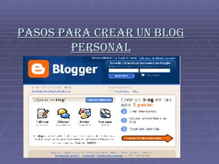 Este documento proporciona 6 pasos para crear un blog personal: 1) Crear una cuenta en Google, 2) Asignarle un nombre al blog, 3) Elegir una plantilla, 4) Crear entradas de blog, 5) Insertar imágenes, y 6) Insertar videos.