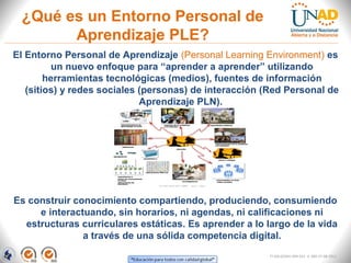 El documento explica qué es un Entorno Personal de Aprendizaje (PLE) y una Red Personal de Aprendizaje (PLN). Un PLE es un enfoque para "aprender a aprender" utilizando herramientas tecnológicas, fuentes de información y redes sociales para construir conocimiento compartiendo, produciendo e interactuando sin horarios o estructuras curriculares fijas. Una PLN son las interacciones que establece una persona para aprender a través del intercambio de información y recursos. Crear un PLE genera un