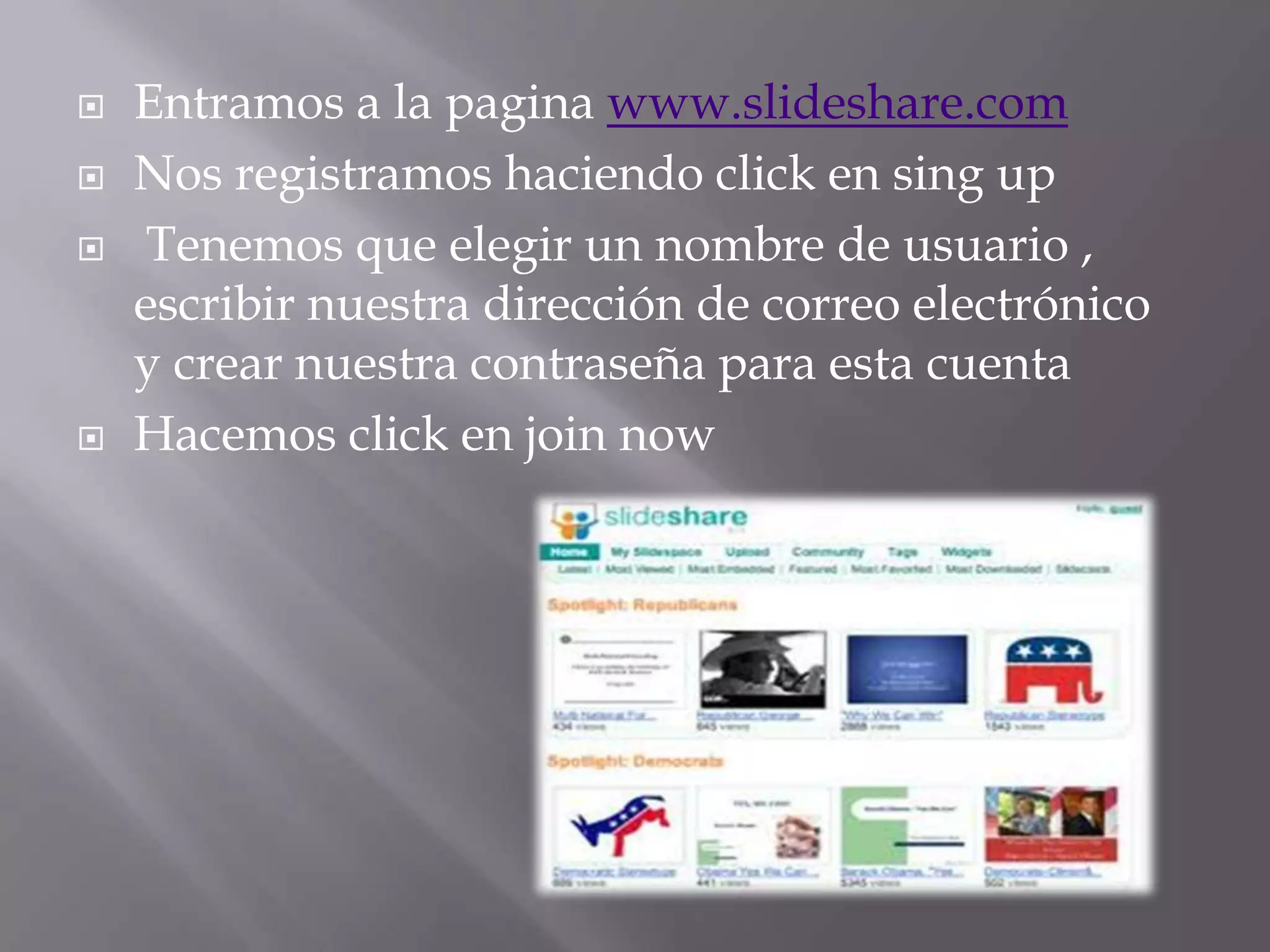 El documento proporciona instrucciones para crear una cuenta en Slideshare, un sitio web que permite a los usuarios subir presentaciones de PowerPoint u OpenOffice para compartirlas en línea de forma gratuita. Los pasos incluyen registrarse, completar los detalles de la cuenta, confirmar la cuenta y luego cargar presentaciones que se convertirán automáticamente a formato Flash para poder verse en línea.