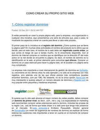 El documento proporciona instrucciones sobre cómo crear un sitio web propio. Explica que el primer paso es registrar un dominio, que es el nombre de la página web y debe ser único. Luego, se debe contratar alojamiento web, que mantiene el sitio disponible en un servidor las 24 horas. Finalmente, cubre aspectos a considerar al elegir un proveedor de alojamiento como el espacio de almacenamiento, tráfico esperado y características necesarias como correo electrónico o seguridad SSL.