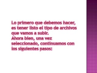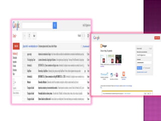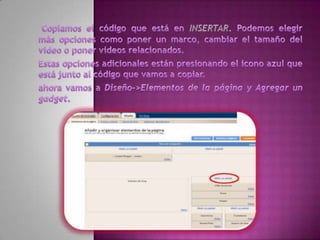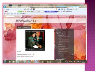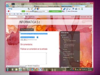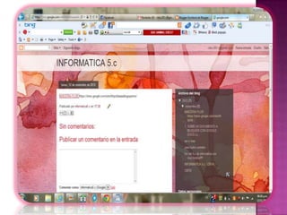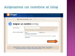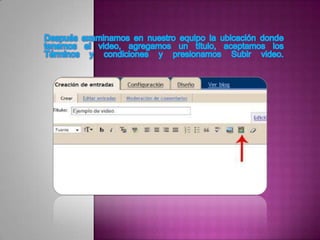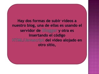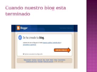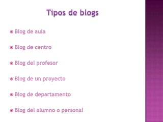 El documento describe diferentes tipos y usos de blogs, incluyendo blogs educativos creados por docentes y estudiantes, blogs personales, blogs de empresas y blogs sobre diferentes temas como tecnología, cultura, educación y más. También explica cómo crear un blog en Blogger, incluyendo elegir un nombre, plantilla y categorías, y cómo agregar videos u otros archivos al blog.