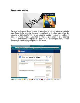 Este documento brinda conceptos básicos sobre blogs, incluyendo su definición, clasificación, composición, uso y aplicaciones. Explica lo fácil que es crear un blog propio y participar e interactuar con otros a través de blogs ya existentes. Menciona algunas ventajas de los blogs como ser medios económicos de publicidad y permitir divulgar información, así como también algunas desventajas como la posibilidad de que el administrador publique demasiada información o contenido no apropiado.