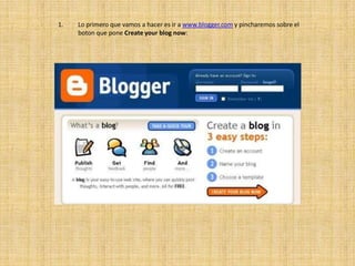 Este documento explica los pasos para crear un blog en Blogger. Primero, se debe ir a www.blogger.com y crear una cuenta con un nombre de usuario y contraseña. Luego, se debe dar un título y dirección URL al blog, elegir un diseño, y publicar el primer post. Finalmente, se pueden personalizar opciones como el título, descripción y configuración de comentarios del blog.