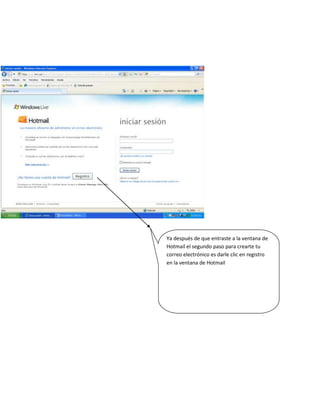 Para crear un correo electrónico en Hotmail, primero se debe ingresar a la página de Hotmail en un explorador web y hacer clic en "registro" para ingresar los datos personales requeridos. Luego se debe crear una contraseña y completar el perfil de usuario. Una vez creado el correo, se puede acceder a la bandeja de entrada para revisar mensajes recibidos y enviar nuevos mensajes adjuntando archivos. También se pueden agregar contactos haciendo clic en "Messenger" y buscando el nombre del contacto a