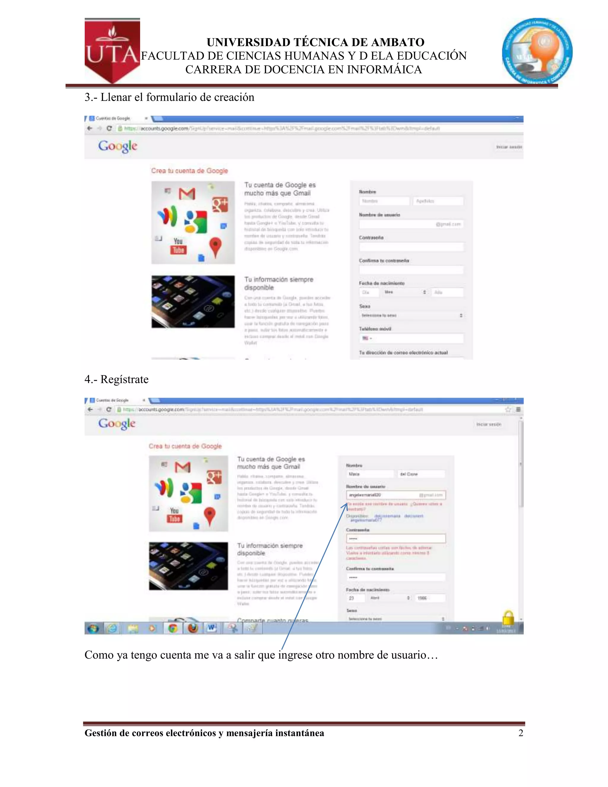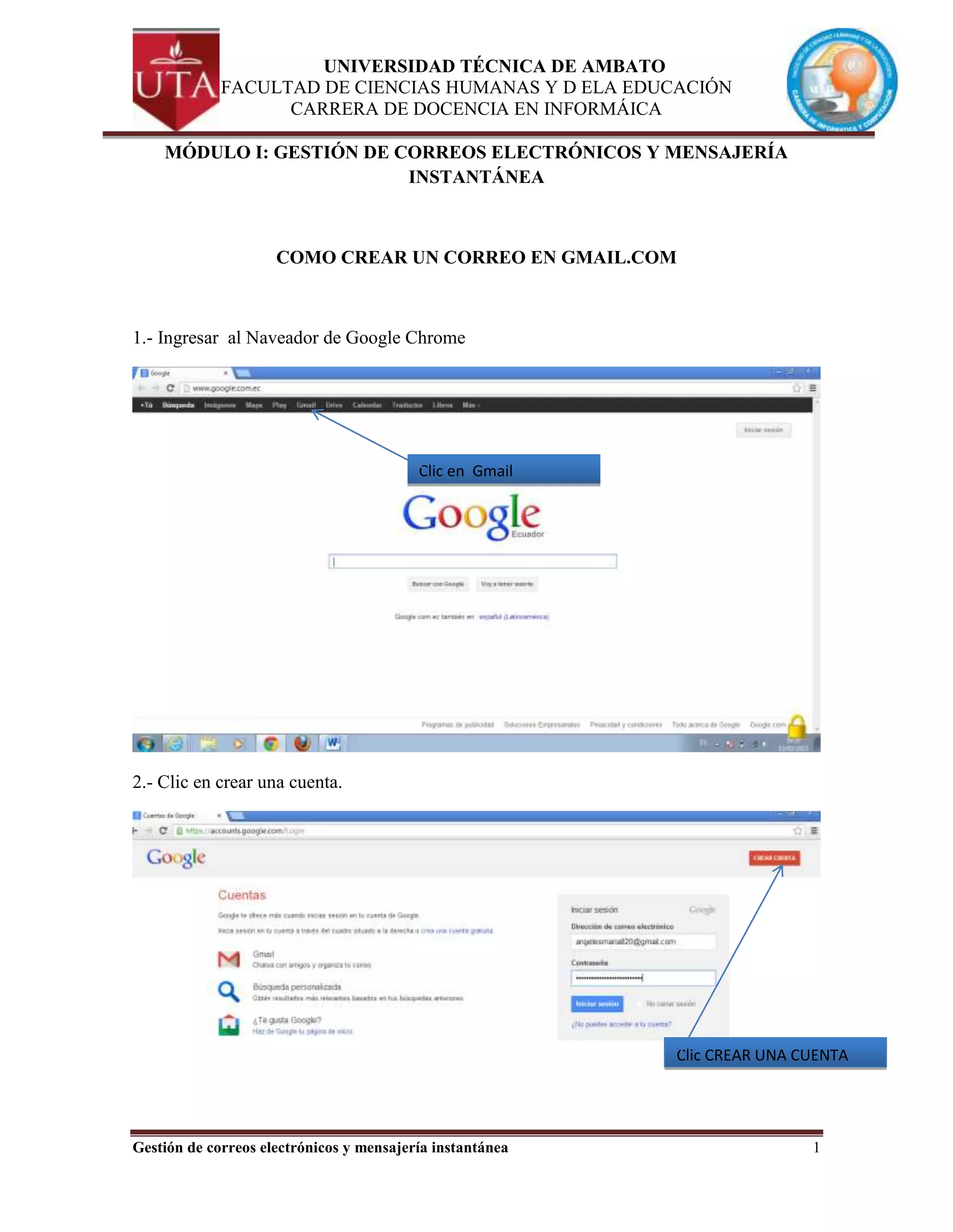 El documento describe los pasos para crear una cuenta de correo electrónico en Gmail.com, que incluyen ingresar a la página de Gmail, hacer clic en "Crear una cuenta", llenar un formulario con la información personal, verificar la cuenta a través de un código enviado al teléfono, e ingresar el código para finalizar la creación de la cuenta de correo.