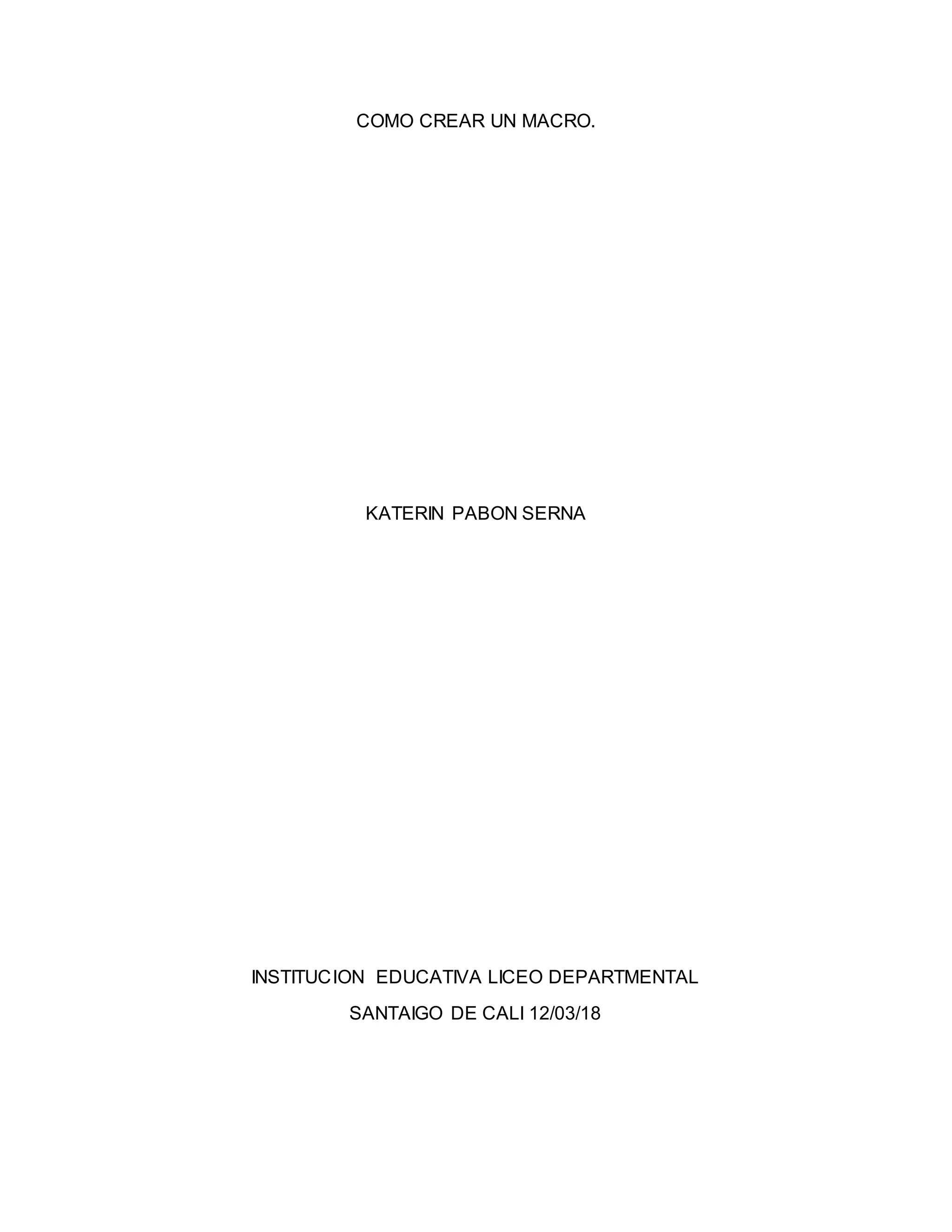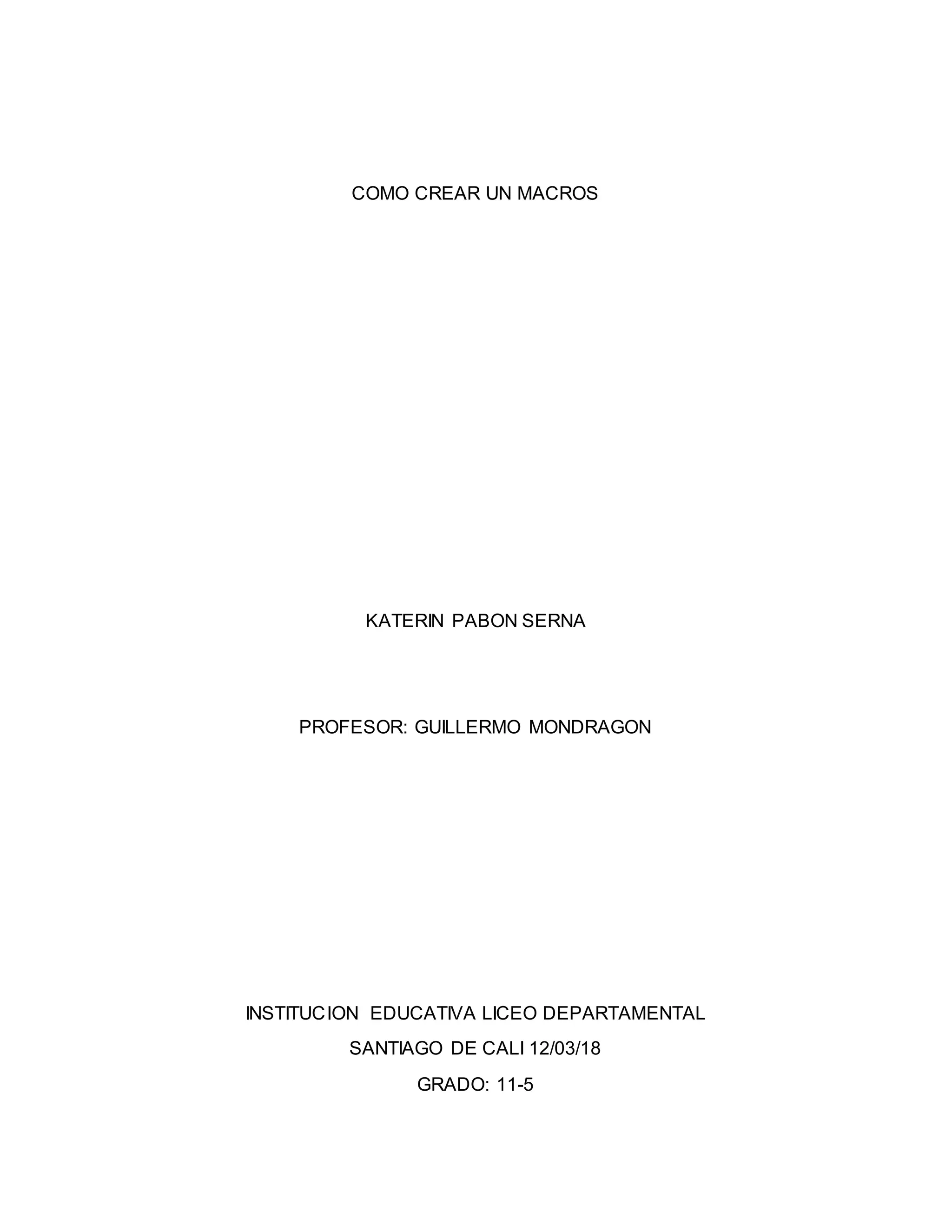 El documento explica cómo crear macros en Microsoft Excel. Describe los pasos para grabar una macro, incluyendo habilitar la pestaña Desarrollador, darle un nombre a la macro, grabar las acciones y detener la grabación. También cubre cómo ejecutar macros mediante la pestaña Programador, teclas de método abreviado o botones personalizados, y cómo eliminar macros existentes.