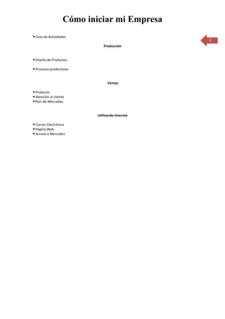 El documento describe los primeros pasos para iniciar un emprendimiento, incluyendo cómo descubrir oportunidades de negocio, encontrar ideas, y obtener financiamiento. Explica que las ideas pueden provenir de observaciones de cambios sociales, necesidades insatisfechas, o combinaciones de productos y servicios existentes. También enumera varias fuentes potenciales de ideas como invenciones, intereses personales, y deficiencias de otros negocios. Finalmente, brinda consejos sobre cómo evaluar ideas preliminarmente y elegir aquellas con mayor potencial de éxito