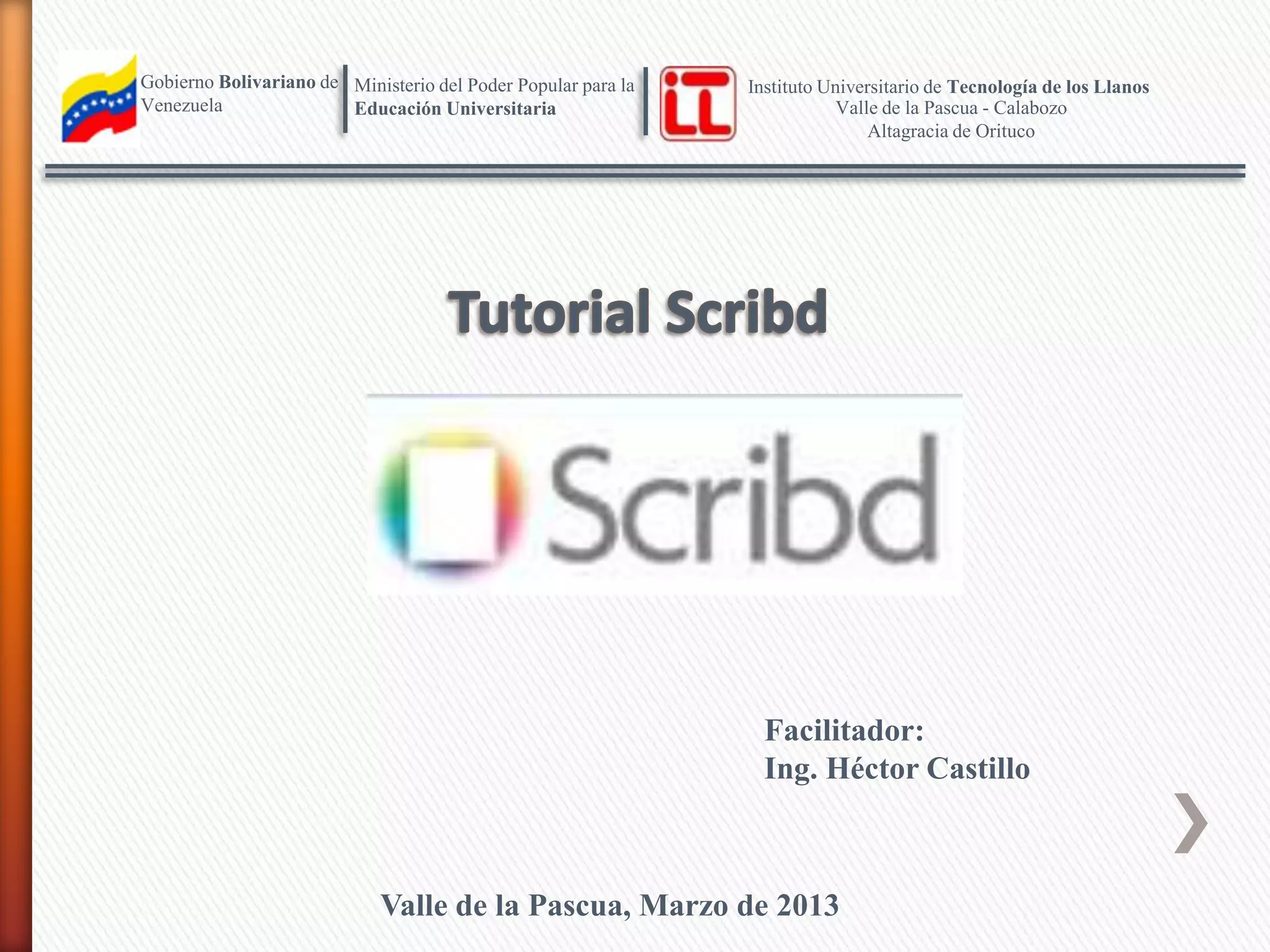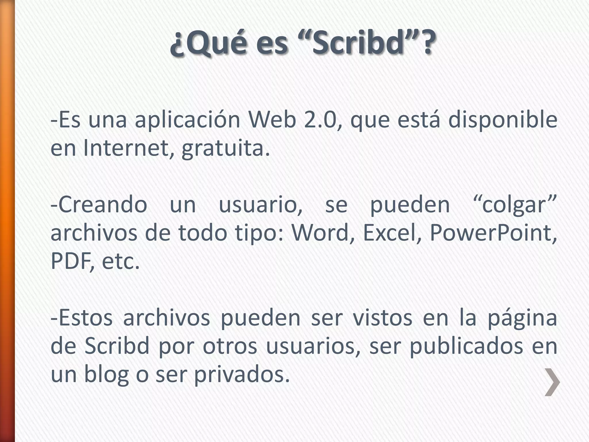 Este documento explica cómo usar la aplicación web Scribd para subir y compartir archivos en línea de forma gratuita. Describe los pasos para crear una cuenta de usuario en Scribd, navegar a la página principal, seleccionar un archivo para subir desde la computadora, y editar la información y compartir el enlace del archivo una vez publicado. Scribd permite a los usuarios ver, editar y compartir una variedad de archivos de forma sencilla a través de su navegador web.