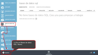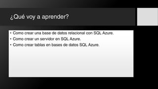 * Como crear una base de datos relacional en SQL Azure. * Como crear un servidor en SQL Azure. * Como crear tablas en bases de datos SQL Azure.