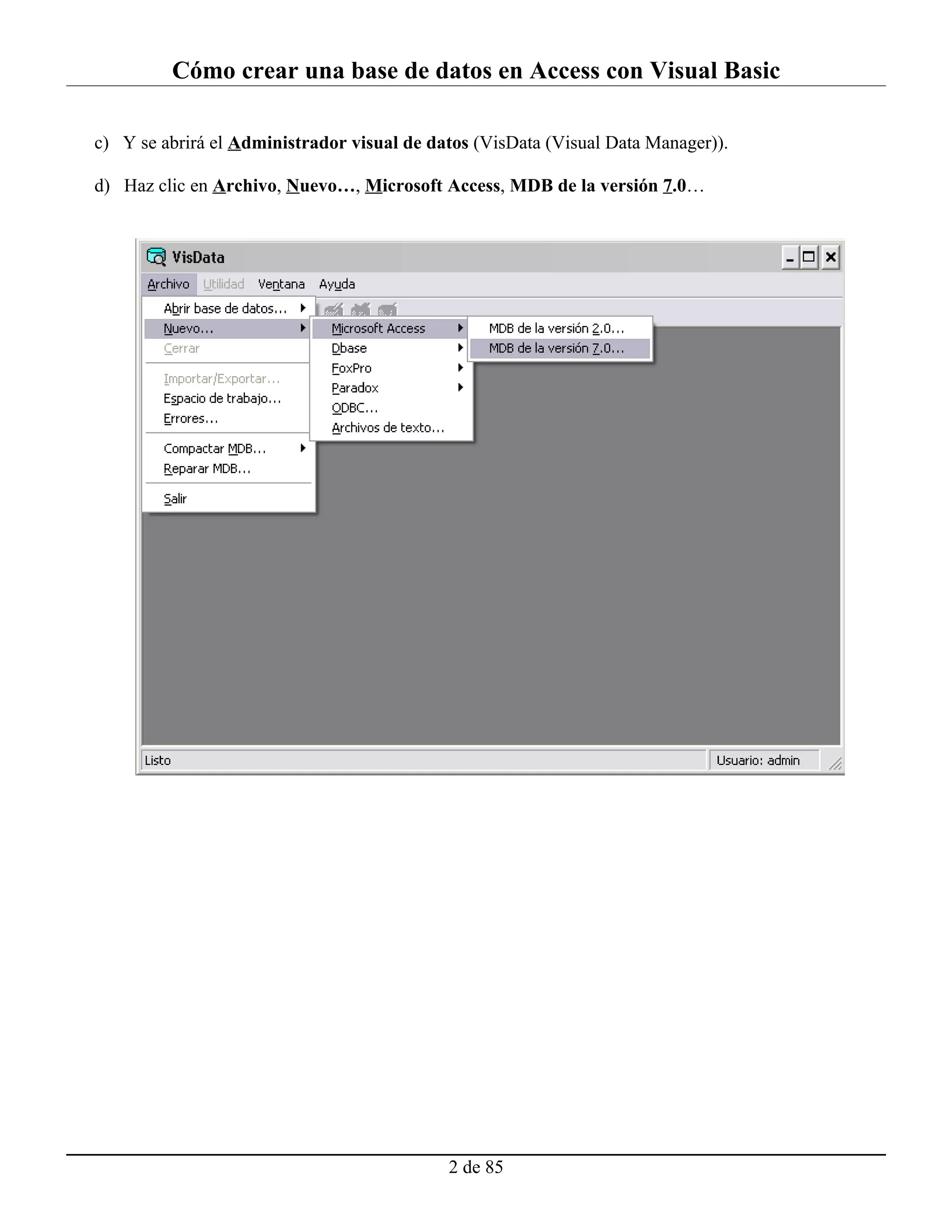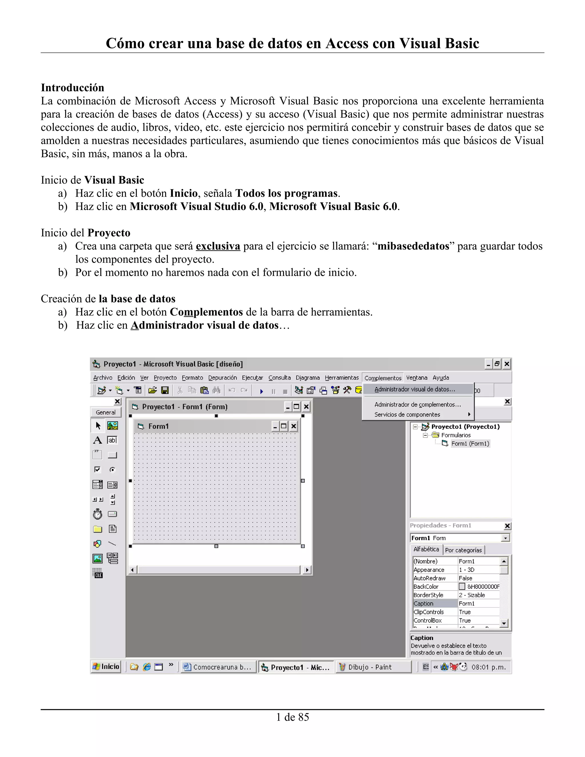 Este documento describe cómo crear una base de datos en Access utilizando Visual Basic. Explica cómo iniciar Visual Basic y un nuevo proyecto, crear la base de datos en Access y tablas, introducir datos, crear formularios vinculados a las tablas, agregar menús y opciones de menú para realizar acciones como agregar, guardar, buscar y eliminar registros, y crear reportes vinculados a la base de datos.