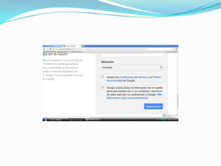 El documento describe los pasos para crear una cuenta de Gmail, incluyendo llenar los espacios en blanco y aceptar los términos y condiciones, verificar la cuenta con un código enviado al teléfono, y luego crear un perfil opcional antes de acceder al correo electrónico.