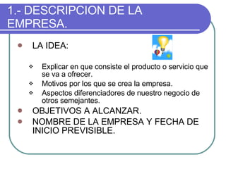 Este documento presenta un plan de empresa detallado que incluye una descripción de la empresa, los promotores, la forma jurídica, la ubicación, los productos o servicios, el plan de marketing, la organización, las inversiones y la financiación. El plan cubre todos los aspectos clave necesarios para establecer y operar exitosamente una nueva empresa, como la idea del negocio, los objetivos, el análisis de mercado, la producción, el personal, los riesgos y una evaluación DAFO.