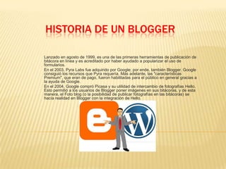 El documento presenta la historia y funcionalidad del servicio de blogs Blogger. Comenzó en 1999 como una de las primeras herramientas de blogs en línea y fue adquirido por Google en 2003. Esto permitió que Blogger obtuviera más recursos y características premium gratuitas. También se discuten los diferentes tipos de blogs educativos como blogs de profesores, aulas y estudiantes.
