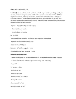 Un WebQuest es una herramienta de aprendizaje guiado que utiliza recursos de Internet para promover habilidades cognitivas superiores y trabajo cooperativo. El documento proporciona instrucciones paso a paso para crear un WebQuest sobre Tecnologías de la Información y Comunicación (TICs) que incluya definiciones, ventajas, desventajas y características de TICs y Nuevas TICs, así como una evaluación y conclusión personal.