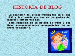 Este documento ofrece información sobre cómo crear y usar un blog. Explica que los blogs surgieron en 1993 como sitios web actualizados periódicamente con artículos y comentarios de uno o más autores en orden cronológico. Los blogs sirven para compartir información, debatir ideas, y divertirse. Para crear un blog, se registra una cuenta en plataformas como Blogger o Weblog eligiendo un nombre de dominio y contraseña.