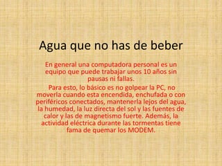 Para alargar la vida de una PC, es importante no golpearla, moverla o exponerla al agua, calor o luz solar. También se debe usar un estabilizador de tensión, realizar copias de seguridad regularmente, desfragmentar el disco con frecuencia y mantener actualizado el antivirus. Cuidar especialmente el disco duro, que es la pieza más propensa a fallar.