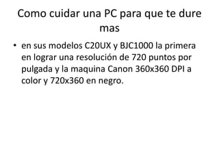 El documento habla sobre cómo cuidar una computadora para que dure más tiempo. Menciona que un estabilizador de tensión y respaldo de energía (UPS) pueden ser útiles para protegerla de fluctuaciones eléctricas. También recomienda hacer copias de respaldo regularmente dado que el disco duro es la pieza más propensa a fallar. Además, sugiere evitar golpes y maltratar la computadora para prevenir daños prematuros.