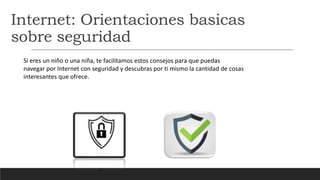 Este documento ofrece consejos para que los niños naveguen de forma segura en Internet y usen las redes sociales, incluyendo no dar información personal, obtener permiso antes de publicar fotos de otros, no responder mensajes de desconocidos, establecer contraseñas seguras y pedir ayuda a un adulto en caso de sentirse incómodos o detectar contenidos inadecuados.
