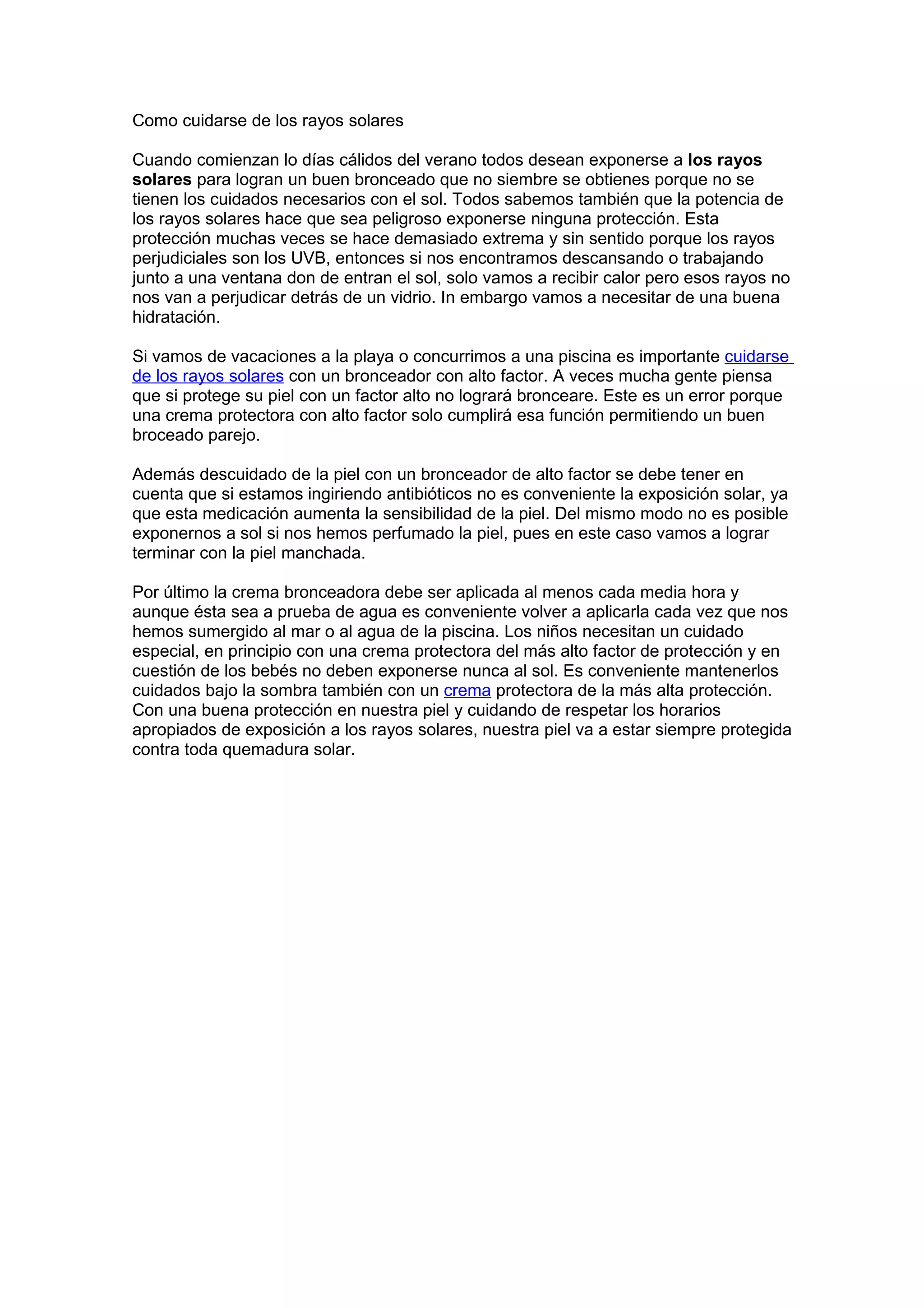 Este documento ofrece consejos para cuidarse de los rayos solares durante el verano, incluyendo usar protector solar de alto factor, reaplicarlo cada media hora y especialmente después de nadar, y proteger a los niños y bebés manteniéndolos a la sombra. También advierte no exponerse al sol si se toman antibióticos o se usa perfume en la piel.