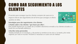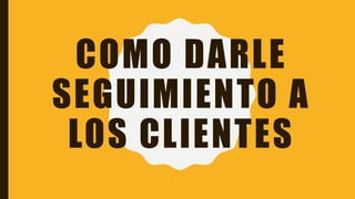 El documento ofrece estrategias para dar seguimiento a los clientes de manera efectiva, incluyendo contactarlos periódicamente para actualizarlos sobre novedades, agradecerles sus compras, y recordarles eventos importantes. El objetivo del seguimiento es fidelizar a los clientes existentes y generar nuevas ventas.