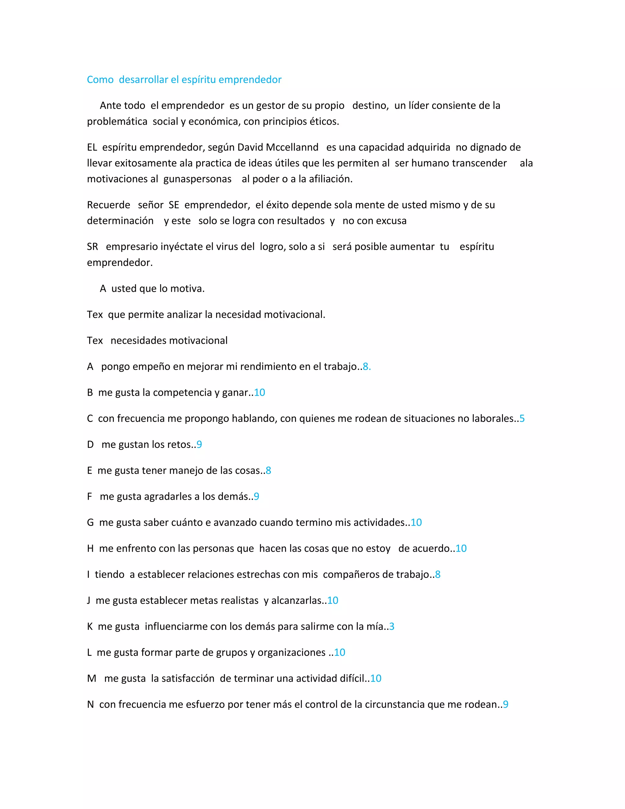 El resumen describe tres elementos clave para desarrollar el espíritu emprendedor. Primero, un emprendedor es un líder con principios éticos que gestiona su propio destino. Segundo, el espíritu emprendedor es una capacidad adquirida para llevar a cabo ideas útiles que permiten trascender motivaciones como el poder o la afiliación. Tercero, el éxito depende de la determinación de una persona y solo se logra con resultados, no excusas.