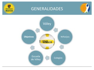 Este documento describe los pasos para desarrollar una escuela de vóleibol. La escuela se enfocaría en niños y adolescentes, utilizando colegios como semillero e implementando talleres deportivos. La escuela incluiría aprendices, instructores y una entidad deportiva o educativa. Los objetivos son promover la actividad física, enseñar valores a través del deporte, masificar el vóleibol en Chile y formar nuevos talentos.