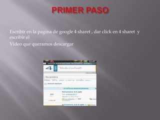 Buscar videos en 4sharet, seleccionar el video deseado y esperar a que cargue para descargarlo haciendo clic en "descargar ahora" después de 20 segundos.