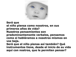 El documento describe el desarrollo del pensamiento en los niños. Explica que al nacer, los niños tienen ciertas capacidades innatas como succionar y tragar, pero que su pensamiento se desarrolla a través de la interacción con los sentidos y el medio ambiente. Antes de dominar el lenguaje, el pensamiento de los niños se basa en las sensaciones y experiencias. El desarrollo del lenguaje les permite comunicarse y organizar mejor sus ideas. A medida que los niños aprenden el lenguaje verbal, van internalizando un pensamiento