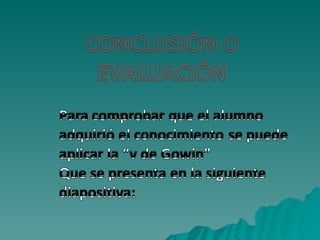 El documento describe una evaluación de aprendizaje sobre mezclas homogéneas y la preparación de la mayonesa. Los estudiantes deben responder preguntas sobre la definición de mezcla, los tipos de mezclas, ejemplos de mezclas homogéneas y describir el procedimiento para hacer mayonesa. La evaluación incluye secciones sobre teoría, mapa conceptual, hechos, observaciones, análisis de datos y conclusiones para comprobar que los estudiantes entienden los conceptos clave sobre mezclas homogéneas.