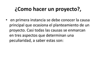 Este documento describe los pasos para elaborar un proyecto. Primero, se debe conocer la causa principal que motiva el proyecto. Luego, el proyecto debe responder preguntas como el título, objetivos, alcance, destinatarios y plazos. También debe incluir una metodología, recursos humanos y materiales, y un plan de evaluación. El autor proporciona detalles sobre cómo incluir cada una de estas secciones para elaborar un proyecto completo.