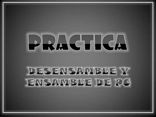 Este documento presenta los pasos para desmontar y volver a montar una computadora. Contiene los nombres de 4 alumnos y su maestro de la asignatura de Ensamble en el semestre 5 para la especialidad de Informática. Luego enumera los pasos para quitar la tapa del gabinete, desatornillar y desconectar las diferentes piezas como la unidad óptica, tarjeta madre y fuente de poder, y los pasos inversos para volver a montarla.