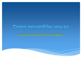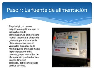 El documento describe los 9 pasos para armar una computadora desde cero. Estos incluyen 1) montar la fuente de alimentación, 2) colocar el procesador en la motherboard, 3) fijar la motherboard al gabinete, 4) agregar la memoria RAM, 5) conectar cables a la motherboard, 6) agregar placas adicionales, 7) conectar dispositivos de almacenamiento, 8) organizar los cables, y 9) conectar periféricos y energía para probar la computadora.