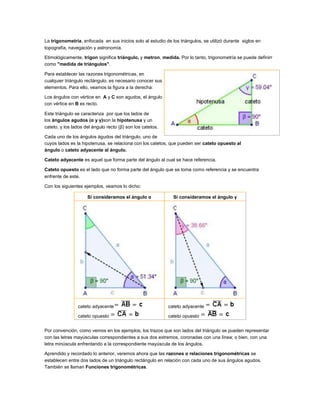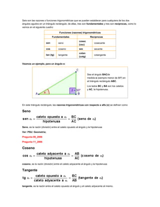 El documento explica los conceptos fundamentales de la trigonometría, incluyendo su definición como la medición de triángulos. Describe las partes de un triángulo rectángulo y define las seis funciones trigonométricas principales y sus recíprocas usando las relaciones entre los lados y ángulos del triángulo. Proporciona un ejemplo numérico para ilustrar los cálculos de las funciones trigonométricas.