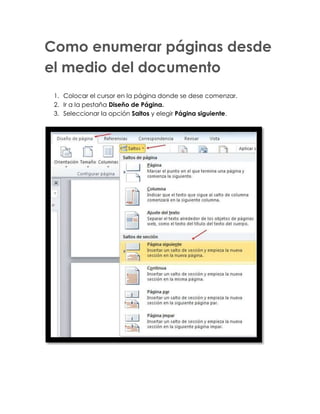 El documento explica cómo enumerar páginas en Word 2010 desde el principio o desde el medio del documento. Para enumerar desde el principio, se inserta el número de página y se selecciona el número inicial deseado. Para enumerar desde el medio, se coloca el cursor en la página inicial, se añade un salto de página y se desactiva la vinculación del encabezado o pie de página para permitir borrar números anteriores.
