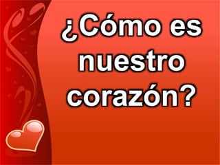 Este documento describe la importancia del corazón según la Biblia. Explica que el corazón representa la voluntad de una persona y que solo Dios puede transformar un corazón maligno. También analiza estrategias del adversario como dejar el corazón insensible, inestable o herido, y cómo circuncidar el corazón es quitar obstáculos para permitir que Dios lo toque. El resultado es tener un corazón alegre, entendido, feliz y en paz.