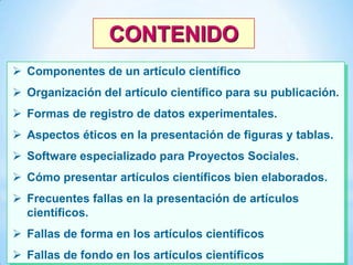 Este documento proporciona información sobre la organización y componentes de un artículo científico para su publicación. Explica los pasos para la elaboración de un artículo, incluyendo la identificación de un tema relevante, el desarrollo de ideas coordinadas, y la evaluación del trabajo. También describe los componentes clave de un artículo científico como la introducción, métodos, resultados y conclusiones. Además, cubre aspectos éticos en la presentación de datos y ofrece consejos para elaborar artículos científicos de al