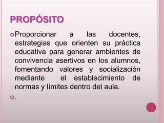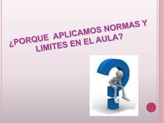 El documento proporciona orientación a los docentes sobre cómo establecer normas y límites en el aula para promover ambientes de convivencia positiva. Explica que las normas ayudan a los estudiantes a distinguir entre comportamientos permitidos y prohibidos, brindan seguridad y organización, y apoyan el desarrollo y aprendizaje. También ofrece consejos sobre cómo comunicar normas de manera clara y consistente, así como sobre el uso de consecuencias apropiadas cuando las normas no se siguen.