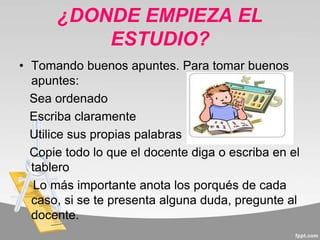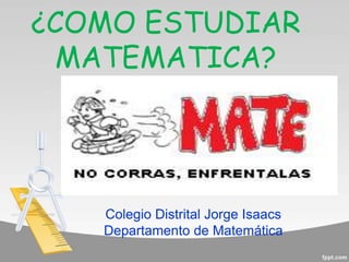 Este documento ofrece consejos para estudiar matemáticas de manera efectiva. Recomienda tomar buenos apuntes de manera ordenada y clara, repasar regularmente para evitar olvidar el material, y encontrar un lugar tranquilo para estudiar y practicar resolviendo ejercicios. Enfatiza que la mejor forma de aprender matemáticas es practicando y resolviendo problemas por uno mismo, en lugar de solo escuchar explicaciones o que otros lo resuelvan.