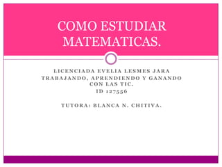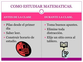 Este documento ofrece consejos para estudiar matemáticas de manera efectiva, incluyendo prepararse antes de clase, tomar buenos apuntes, elaborar un horario de estudio, estudiar solo y en grupo, mostrar interés al hacer preguntas, ampliar el estudio antes de exámenes, y ver el estudio como algo útil para la vida.