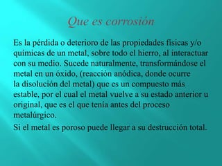 La corrosión es la transformación de un metal a su forma iónica o combinada a través de la interacción con su medio, formando óxidos u otros compuestos más estables. Ocurre naturalmente cuando los metales retornan a su estado original. Si el metal es poroso, puede llegar a su destrucción total. Algunos métodos para prevenir la corrosión incluyen el uso de acero inoxidable, recubrir el acero con zinc o plásticos especiales, y pintar el acero con pinturas anticorrosivas.