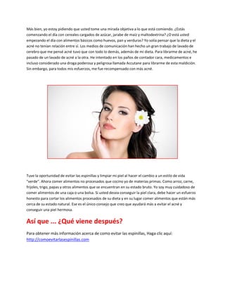 Evitar las espinillas requiere corregir la dieta y hacer cambios de estilo de vida para lograr un equilibrio interno. Un estilo de vida saludable implica comer alimentos no procesados que se han evolucionado para el consumo humano, en lugar de alimentos procesados con alto contenido de sodio y conservantes. Cambiar a una dieta basada en alimentos sin procesar como frutas, verduras, granos y proteínas ayuda a evitar espinillas y obtener una piel clara.