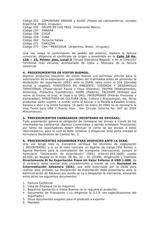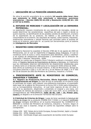 El documento proporciona información sobre los procedimientos requeridos para exportar productos de Colombia. Estos incluyen 1) ubicar la posición arancelaria del producto, 2) realizar un estudio de mercado para identificar la demanda potencial, y 3) registrarse como exportador ante el gobierno. También describe los procedimientos ante el Ministerio de Comercio para obtener certificados de origen, realizar trámites cambiarios y aduaneros, y cumplir con otros requisitos regulatorios para exportar el producto.